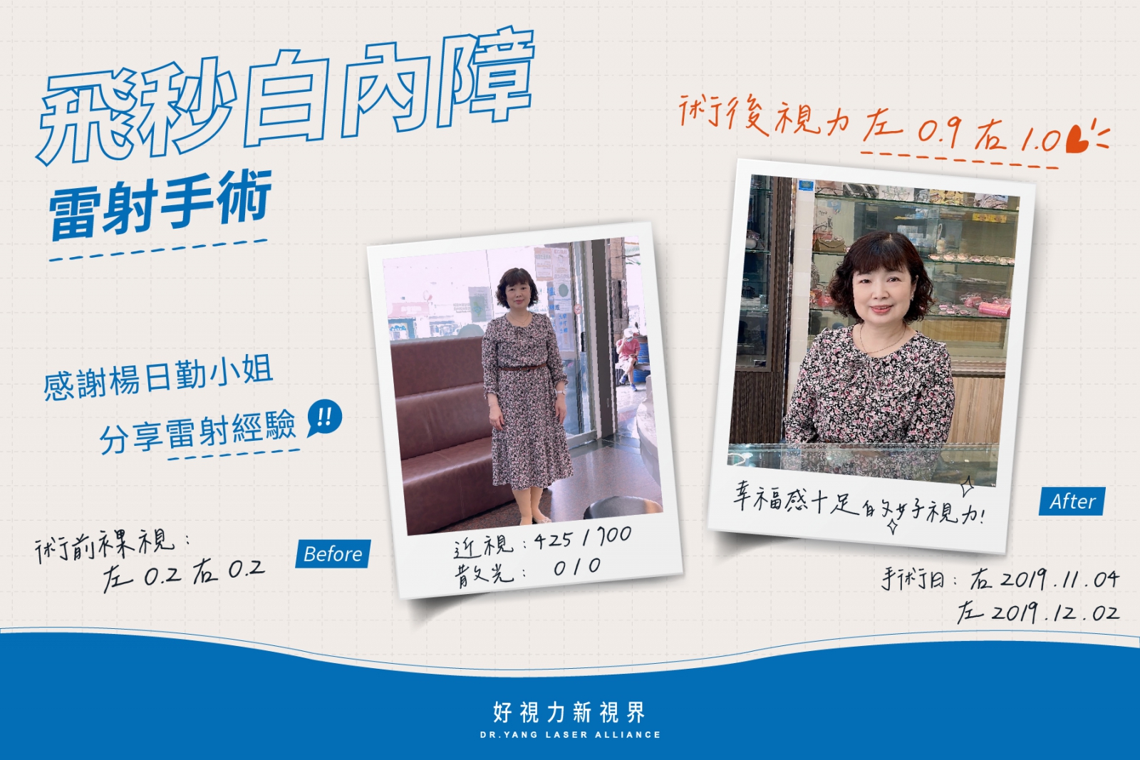 術後4小時就可以自行拆開包紮,一睜眼我就發現視力有非常大的改變,周遭景物看得很清晰,不管是看電視、看遠方都不需要戴眼鏡,跟術前相比簡直是天壤之別,很感謝選對楊志盛院長、也感謝遇到達特楊眼科團隊的服務,如果有視力上的困擾,可以來診所評估或諮詢,我現在很滿意術後的結果,做了一個明智的選擇!