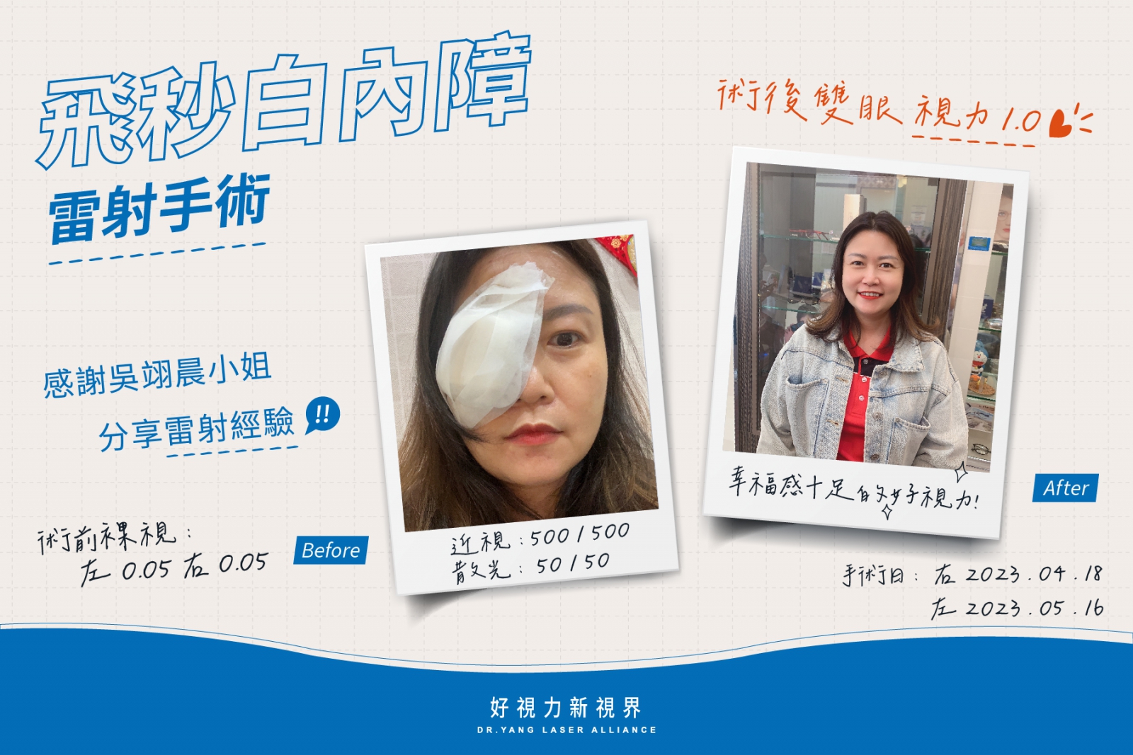 在手術前也因為專員美慧姐的專業叮嚀,大大舒緩了我緊張的情緒,可以很好的配合楊志盛院長,讓手術成功完成!目前術後已經兩個月了,雙眼視力1.0,不管看遠、中、近都很清晰,甚至可以在夜間安全開車,恢復良好!